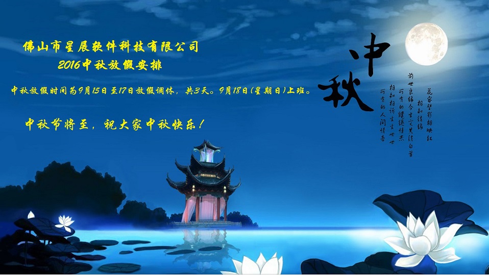 秋风送爽,金桂飘香。在繁忙的工作中,我们即将迎来中秋佳节,借此机会,佛山市星展软件科技有限公司祝各位朋友节日愉快!阖家欢乐!
