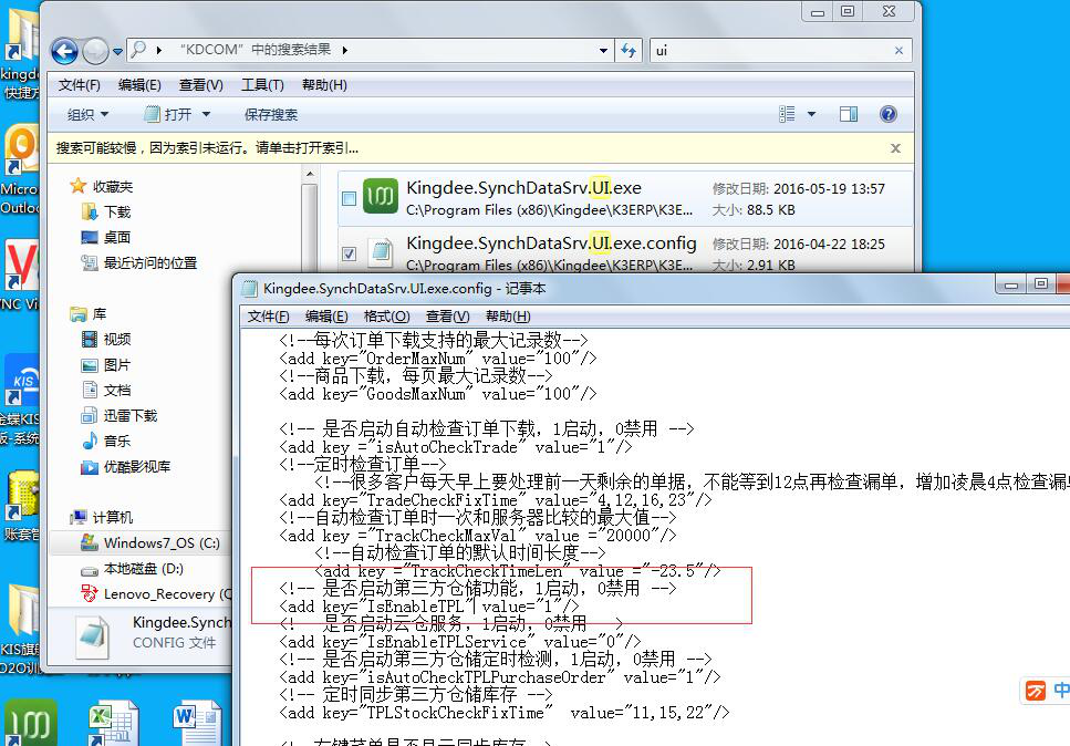 订单100配置文件修改方法:在服务器KDCOM下搜索’ui’,找到订单100的配置文件“kingdee.synchdatasrv.ui.exe.config”,用记事本打开,修改“是否启用第三方仓储功能”中“value=1”。默认第三方仓储定时查询的时间为15分钟,如果客户有需要,可相应修改为10分钟,或者5分钟(注:影响性能,慎重修改)。如图所示:
