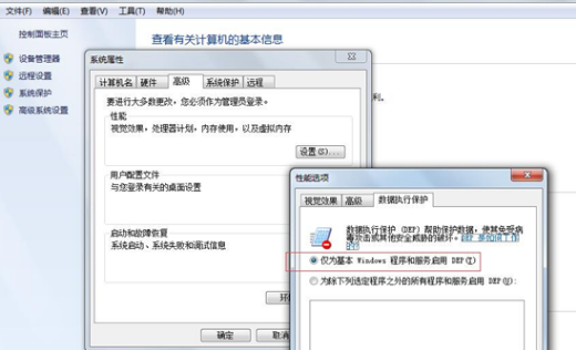 答:计算机属性-高级系统设置-性能-高级中数据执行保护修改为“仅为基础Windows程序和服务启用DEP”(见图右)