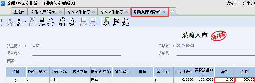 选择相应的单据后,打开并在单价金额处填入预估单价2元,保存。完成估价入库。