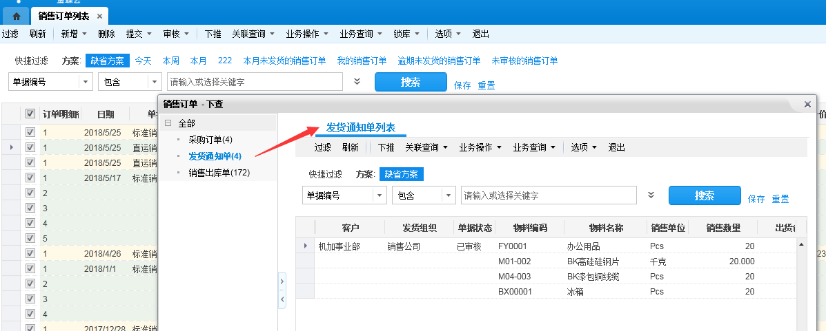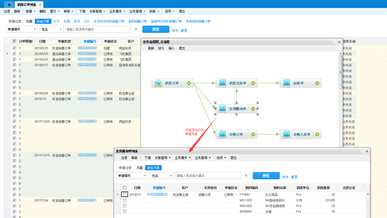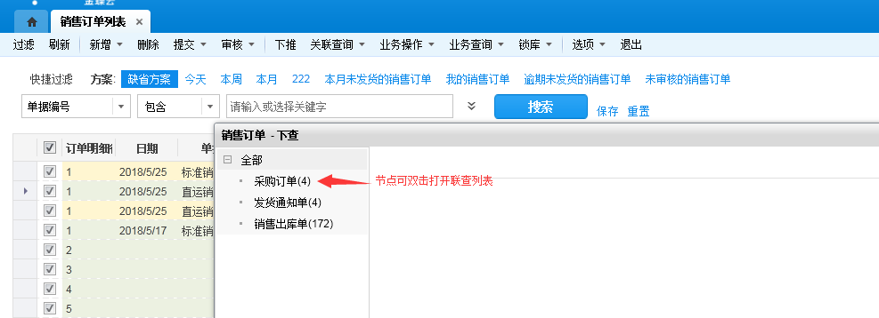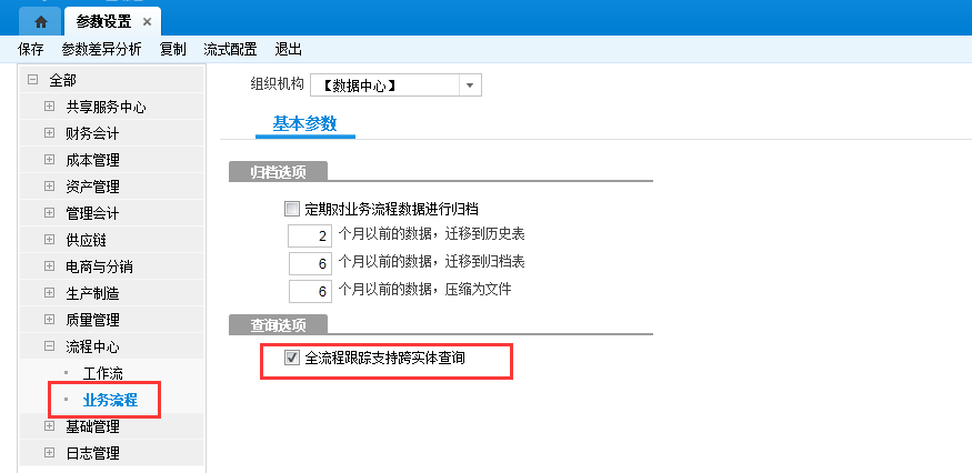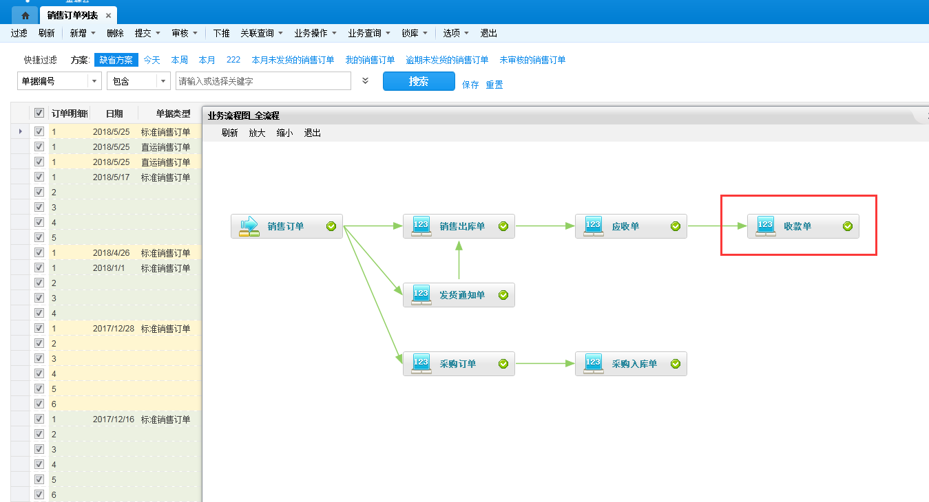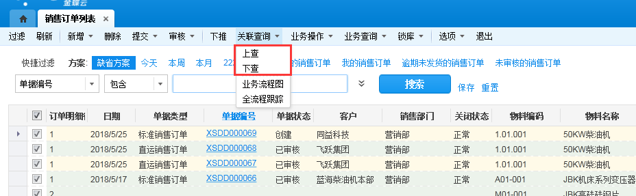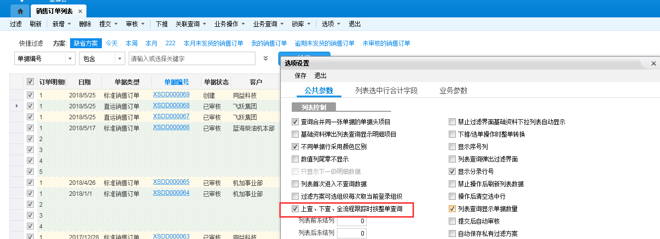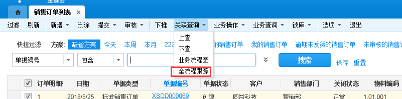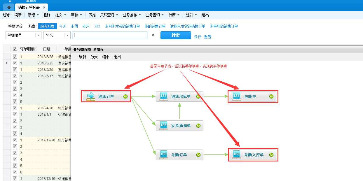当单据通过下推、选单方式生成下游单据时,系统会在关联主实体对应的关联表中记录上下游数据的关联关系。这种关联关系是细化到每一行的。 然后,查看单据时,可以使用【上查、下查、全流程跟踪、业务流程图】的方式联查关联单据数据。 一、上查、下查 功能说明:依据关联关系,显示直接上游或下游的关联单据数据。 1、点击上查或下查。 2、左侧显示联查概览。 3、查看对应单据的联查明细。 二、全流程跟踪 功能说明:依据关联关系,动态构建单据关联关系的流程图。 1、点击全流程跟踪。 2、双击节点,打开关联数据列表 三、业务流程图 功能说明:依据业务流程中心设计的业务流程图,显示图中关联数据已流转的路线。(与全流程跟踪的差异,在于这里是按事先设计的业务流程图查询,全流程跟踪是只按关联数据流转关系动态创建。) 四、联查相关参数 “上查、下查、全流程跟踪按整单联查” 在列表界面默认按照列表过滤所勾选的单据实体进行联查,实现按选中行联查数据;在单据界面按照整个单据的所有实体联查。 勾选选项参数“上查、下查、全流程跟踪时按整单联查”,则可以实现列表界面全流程跟踪操作按列表选中行所对应的单据,进行整单联查。 全流程跟踪支持跨实体联查 入口:administrator登录系统,在【基础管理-公共设置-参数设置】中打开流程中心-业务流程。 注:全流程跟踪默认是按照数据携带产生的数据行关联关系查询,勾选该参数时,会在全流程跟踪结果的首尾末端节点进行整单联查。中间的节点出于性能考虑,不再遍历。 如下图所示,在勾选“全流程跟踪支持跨实体联查”,本次跟踪就会联查出收款单。这是因为本次销售订单明细单据体的数据行携带关系只联查到应收单,应收单下推收款单是从应收单其他单据体中携带数据的,需要在应收单进行整单联查才能查出。 思考:如果下次联查时,应收单已下推销售专票,那么应收单不是末端节点,跨实体联查不会显示收款单节点。需要用户在应收单节点双击打开联查列表,进行再次操作进行整单全流程跟踪联查,可以查到收款单。