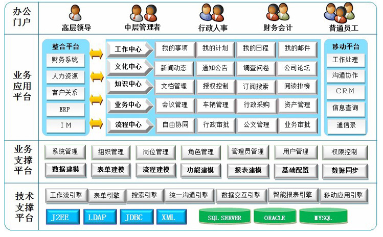 三层平台架构;B/S结构;提供可配置的开发组件,支持不同应用组合;具有标准化的整合机制,全面支撑跨平台、跨数据库的应用。